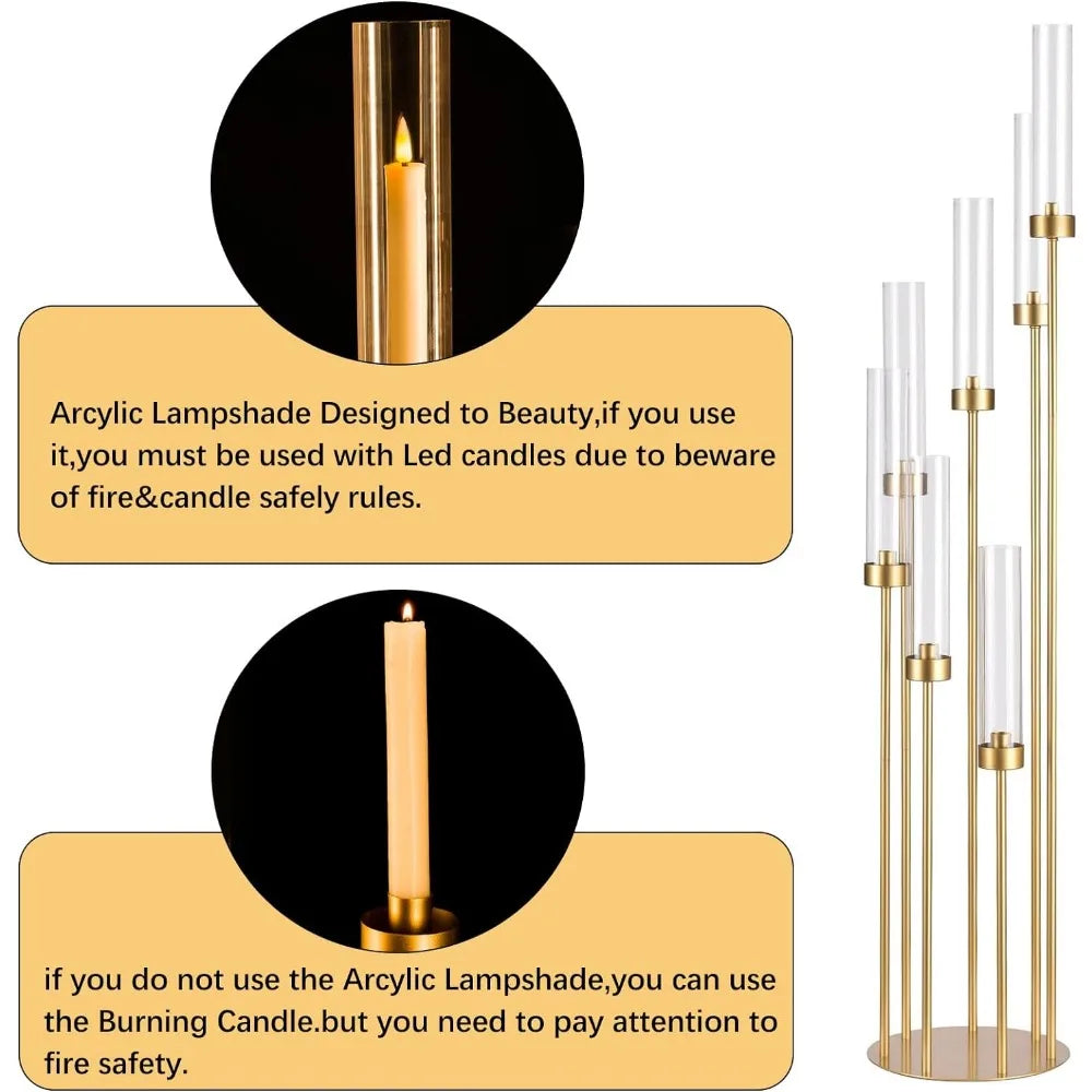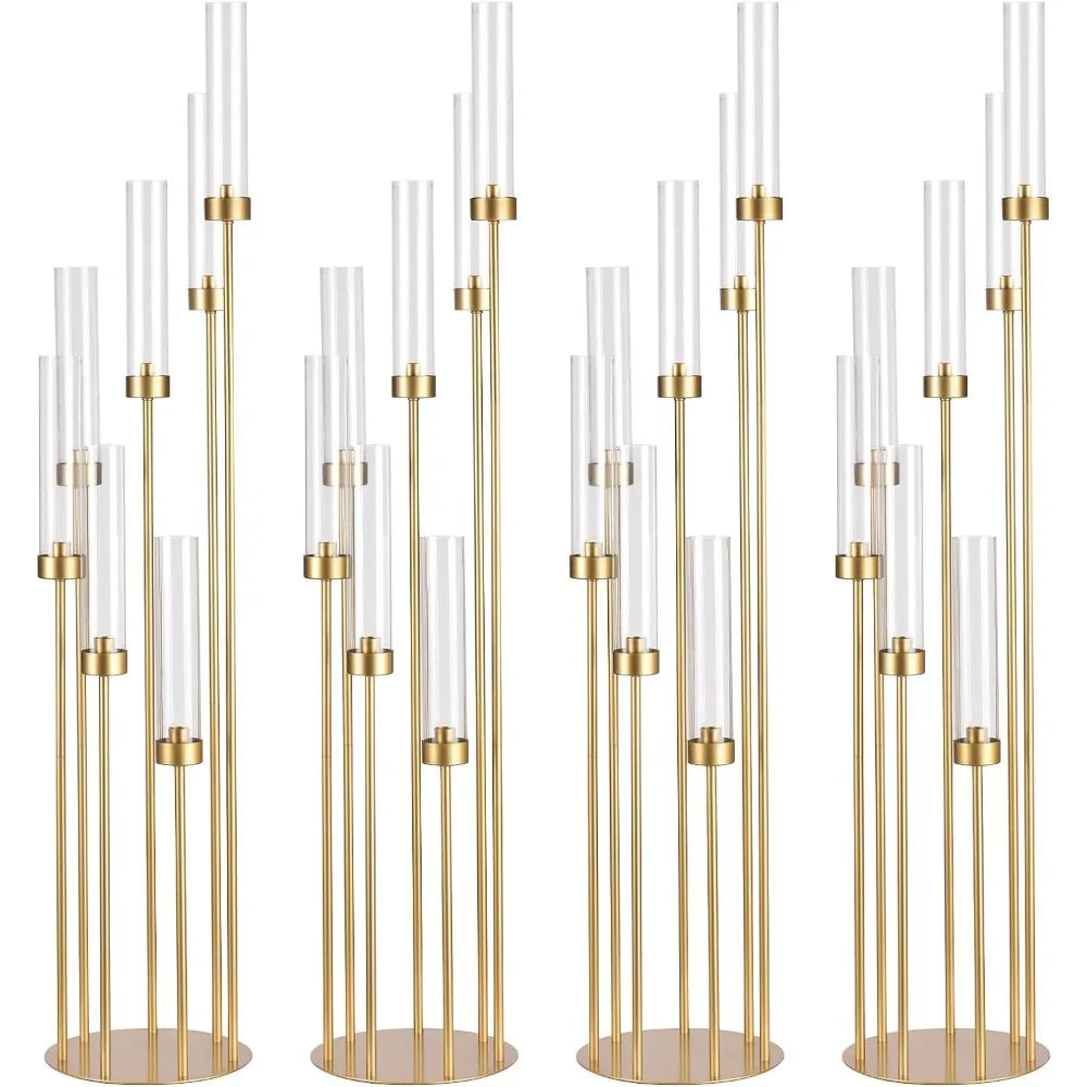 - Quantity: 4 Packs Candle Holder Centerpiece Material: Metal Color: Gold Style: 7-Arm w/ Thick Round Base Overall Height: 48" Arms Heights: 24.6", 28.5", 32.4", 36.2", 40.2", 44", 48",Base Size: 9.36"Dia. Candle Cups Size:0.98" Dia. Note: Candles and other accessories are not included!