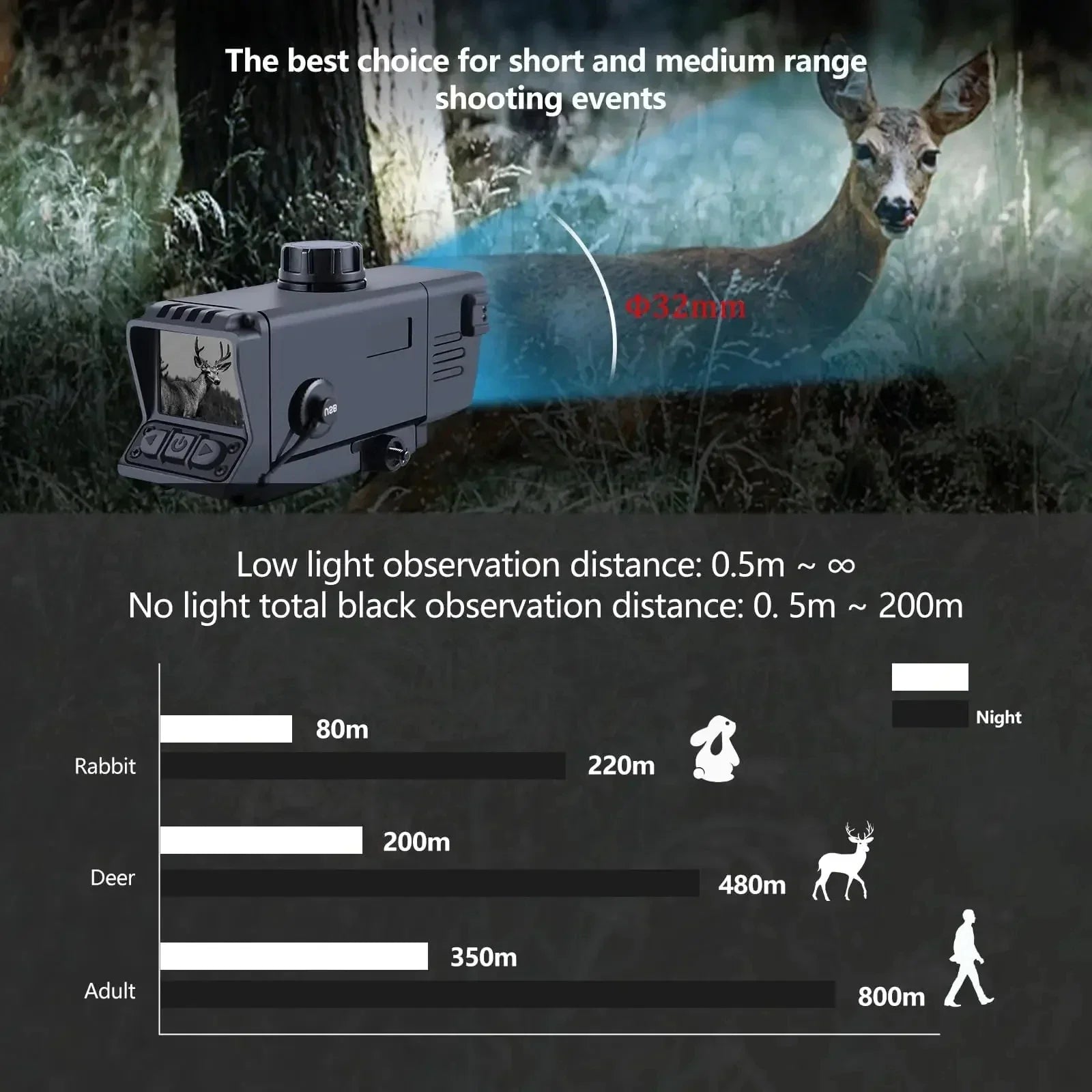 With 850nm infrared illuminator, you can see the target clearly even in complete darkness. Smooth focus adjustment helps you capture clearer photos and videos.
